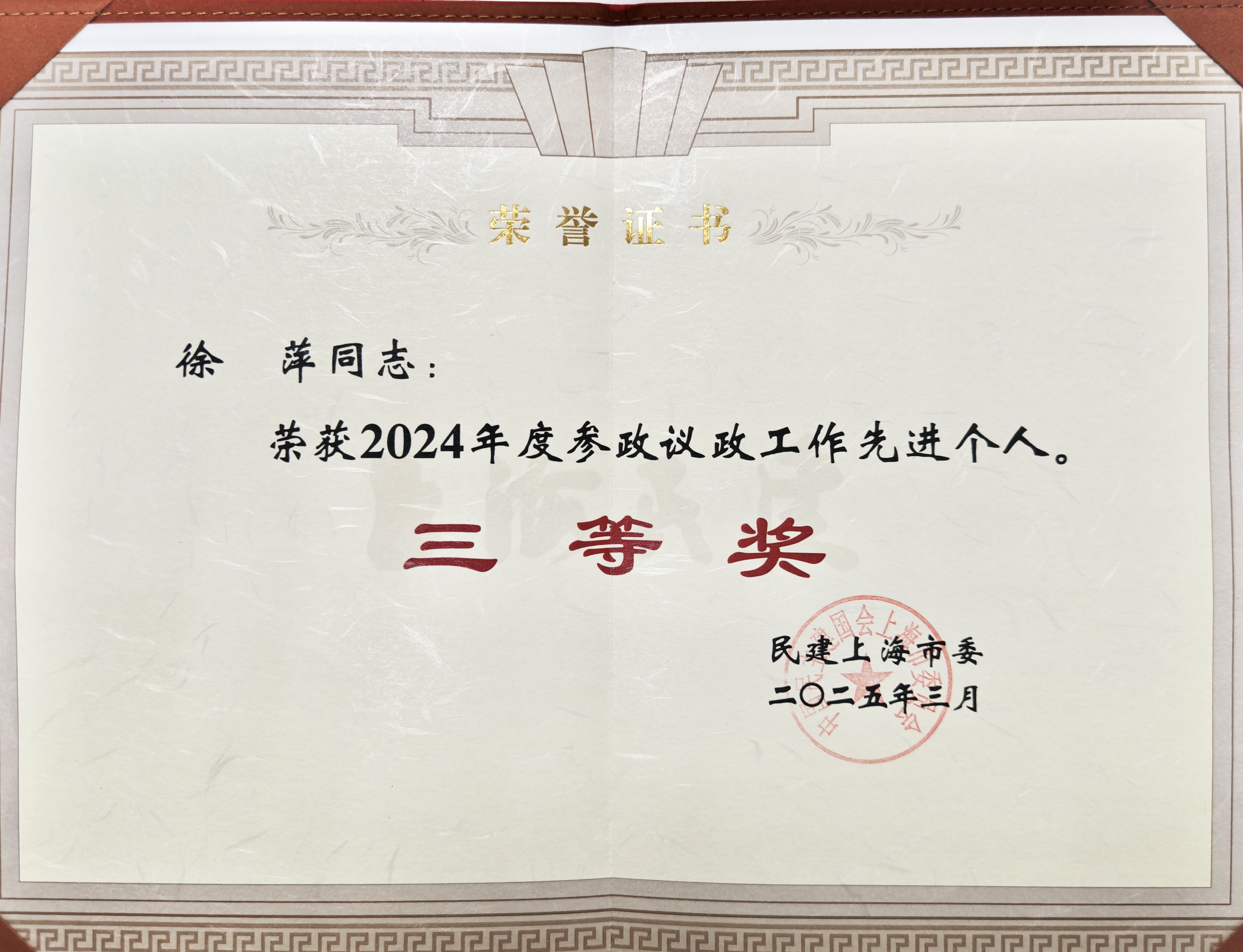 徐萍已連續多次獲得民建上海市委參政議政工作先進個人表彰,并在2024年獲得民建中央“民建組織建設工作先進個人”稱號。其撰寫的社情民意等多次被列入民建市委兩會期間的組織提案,其撰寫的社情民意信息被選作市政協民建界別提案。