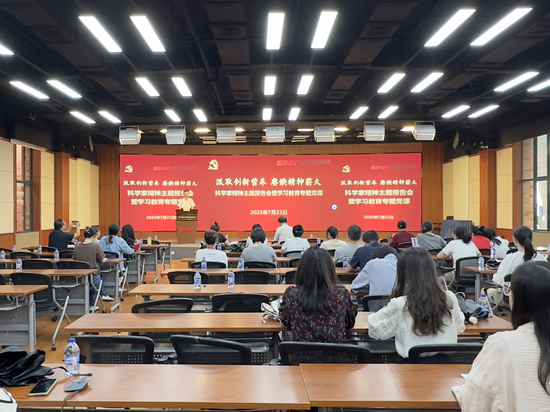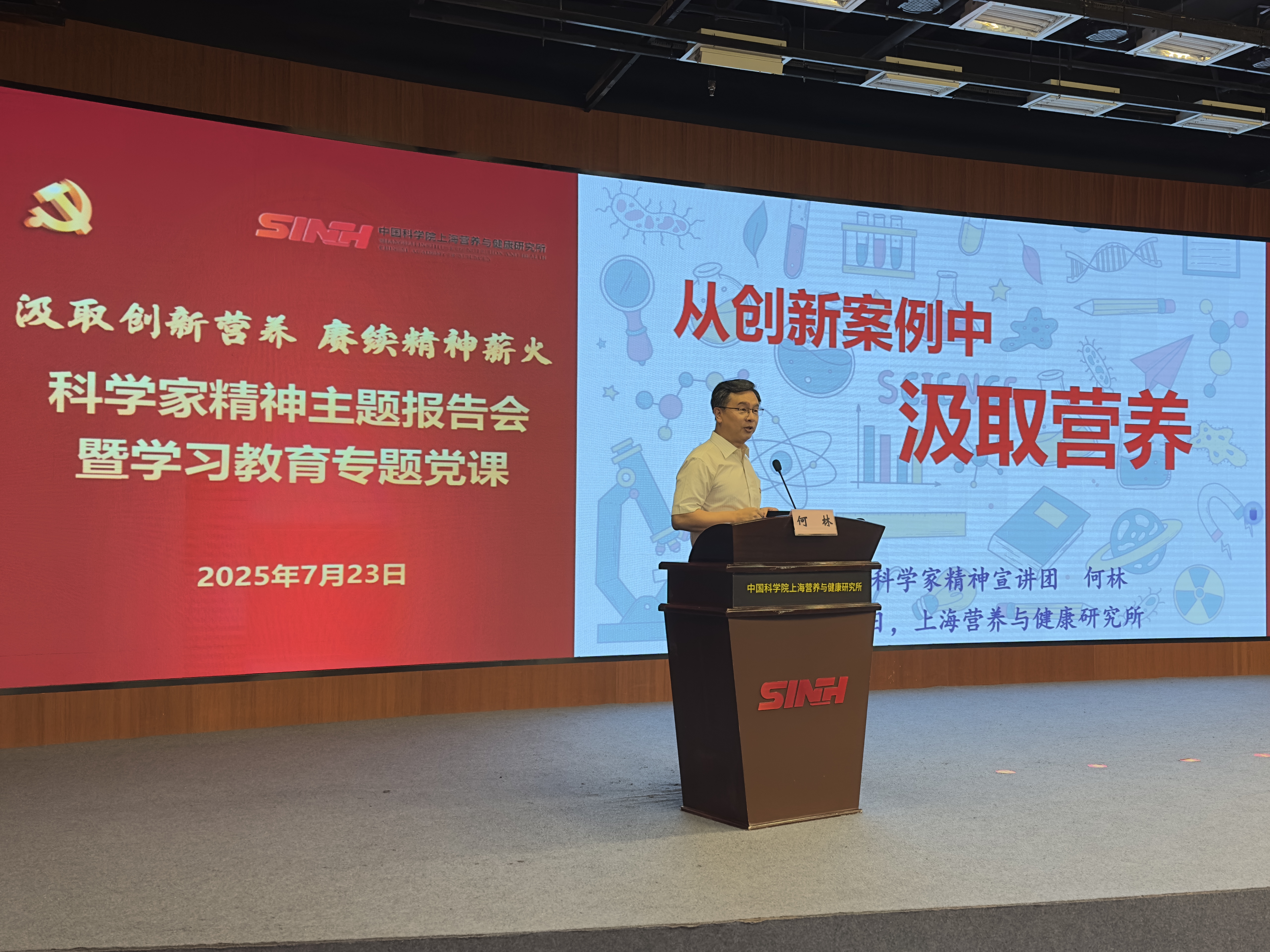 7月23日,中國(guó)科學(xué)院上海營(yíng)養(yǎng)與健康研究所舉辦“汲取創(chuàng)新營(yíng)養(yǎng) 賡續(xù)精神薪火”科學(xué)家精神主題報(bào)告會(huì)暨學(xué)習(xí)教育專題黨課,特邀中國(guó)科學(xué)院科學(xué)家精神宣講團(tuán)成員何林作專題報(bào)告。研究所各黨(總)支部書記、職能部門負(fù)責(zé)人、科研骨干及青年代表等百余人參加學(xué)習(xí),黨委書記瞿榮輝主持報(bào)告會(huì)。