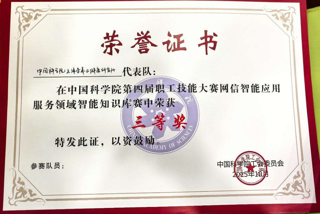 近日,中國科學院上海營養與健康研究所代表隊憑借在智能知識庫建設與人工智能應用領域的創新實力與團隊協作精神,在中國科學院第四屆職工技能大賽智能知識庫賽道中榮獲三等獎。