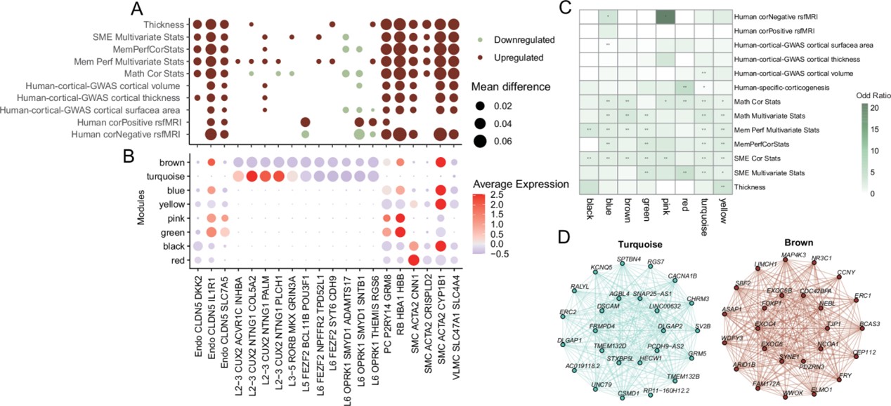 圖: 與進化保守的細胞相比,人腦特有的細胞群(HUCCs)與人類大腦皮質厚度,學習記憶編碼及高級認知功能密切相關。不同的HUCCs用于認知功能和大腦發育的各個方面,這些基因的調控差異可能有助于補充人類大腦中細胞類型與其他物種之間的差異。