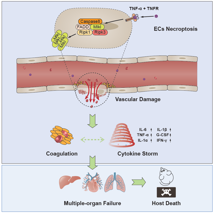 細胞因子的過度分泌會引發(fā)危及生命的全身炎癥反應綜合征,也表現為敗血癥或細胞因子風暴。全球每年有近5000萬SIRS患者,且因SIRS死亡的人數居高不下。在2019冠狀病毒大流行期間,過度的細胞因子風暴也是導致重癥患者死亡的關鍵因素之一。盡管已進行長達30多年的研究,SIRS誘導多器官功能障礙綜合征(MODS)并最終導致死亡的機制仍未明確,至今尚無單一療法能夠有效拯救SIRS患者的生命。因此,深入解析SIRS的病理機制尤為迫切。雖然凝血功能障礙和細胞程序性壞死已被認為是SIRS病理進程中的關鍵因素,但兩者之間的相互作用機制以及具體發(fā)生細胞程序性壞死的細胞類型仍不清楚。
