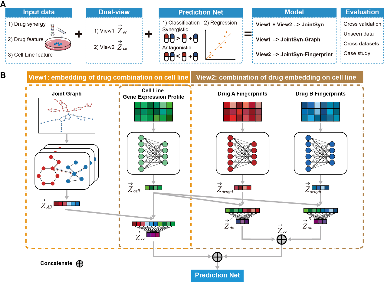 圖1:雙視圖聯合學習JointSyn提高藥物組合協同性能預測