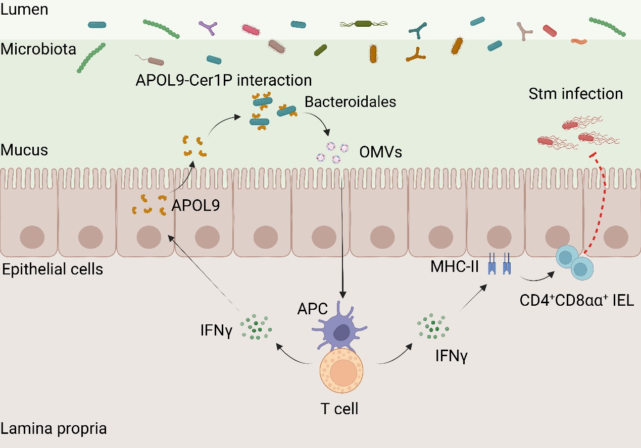 圖:新型載脂蛋白APOL9通過結合擬桿菌Cer1P分子誘導OMVs釋放并激活IFN-γ-MHC-II通路以增強腸道黏膜免疫