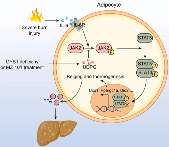 研究團隊發現在燒傷后,小鼠與人類白色脂肪組織中的GYS1表達均顯著上調。脂肪組織特異性Gys1基因敲除能夠有效抑制燒傷引發的白色脂肪組織褐變及脂解過程,改善肝臟脂肪變性并顯著提高生存率。值得注意的是,Gys1敲除并未影響棕色脂肪組織的正常產熱功能,也未緩解肌肉組織的消耗現象。在分子機制上,研究人員發現Gys1缺失會促使UDPG在細胞內大量積累,這些積聚的UDPG通過不依賴β3-腎上腺素能或P2Y14受體通路的獨特方式,有效抑制了IL-6誘導的JAK2-STAT3信號通路的激活。通過分子對接與表面等離子共振實驗,研究團隊證實了UDPG與JAK2蛋白之間存在直接的特異性結合。更重要的是,研究人員采用特異性GYS1小分子抑制劑MZ-101進行燒傷治療,可成功模擬基因敲除的效果,顯著提升脂肪組織內UDPG水平,重現包括抑制白色脂肪組織褐變、改善肝臟脂肪變性在內的多種表型改善效果,并最終顯著提高燒傷實驗動物的生存率。