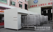 (8)烘干箱內(nèi)可存放1輛推車。推車配置耐高溫角輪(定向輪、萬(wàn)向輪各2個(gè)),推車?yán)锩姘惭b限位柱用于定位里面托盤(pán),兩側(cè)配有L形托架,用于支撐及左右限位托盤(pán)。進(jìn)出口裝有手動(dòng)爐門。頂部部置循環(huán)風(fēng)機(jī)、蒸氣換熱器等裝置,排廢風(fēng)機(jī)安裝在爐體頂部。