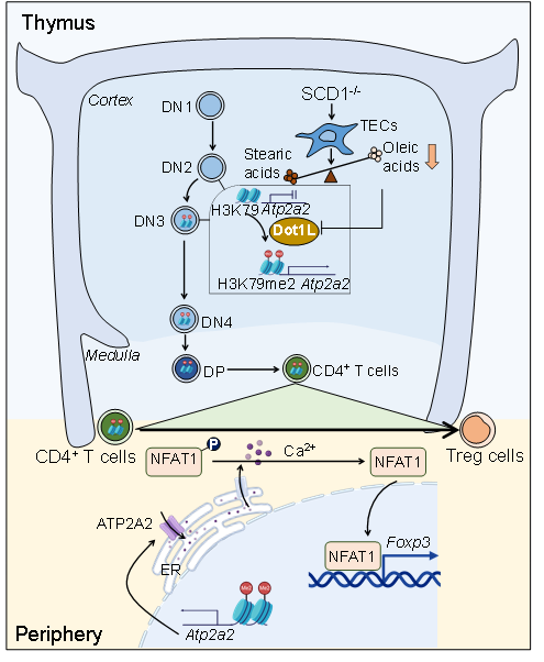 硬脂酰輔酶A去飽和酶(stearoyl CoA desaturase, SCD)是催化來源于食物或者從頭合成的飽和脂肪酸轉變為單不飽和脂肪酸(油酸與棕櫚油酸)的限速酶。其中,人類基因組中的2個SCD基因均與小鼠SCD1基因高度同源。研究發現,SCD1缺失顯著促進小鼠外周血、淋巴結以及主要組織器官中Foxp3+ Treg的數量與比例,并賦予其抵抗自身免疫性疾病的能力,這一現象與SCD1缺失促進初始CD4+ T細胞向Treg分化密切相關。利用條件性敲除小鼠、骨髓移植、胸腺移植和T細胞體外發育等體系,研究揭示SCD1在胸腺上皮細胞中的缺失是導致初始CD4+ T細胞向Treg的分化傾向性增加的主要原因,而非SCD1在T細胞中缺失所引起。更為重要的是,胸腺上皮細胞油酸的可利用性影響初始CD4+ T細胞向Treg分化潛能的關鍵窗口期是胸腺細胞DN2向DN3的發育階段。在油酸缺乏的胸腺微環境中,胸腺細胞內表觀遺傳修飾酶DOT1L活性上調,借以H3K79me2修飾促進DN3胸腺細胞中Atp2a2基因座的染色質開放水平。這一表觀遺傳學印記從DN3階段一直保留至初始CD4+ T細胞,使其在接受T細胞受體激活信號時,通過ATP2A2——calcium——NFAT——Foxp3信號軸促進其向Treg分化。該項研究首次揭示胸腺基質微環境中的油酸信號影響和預編程外周T細胞亞群分化偏好性的細胞與分子機制,不僅為理解不同生理病理環境中T細胞免疫調控機制提供了新視角,也為Treg的定向高效誘導及其在器官移植、自身免疫性疾病等治療中的應用提供新策略與新方向。