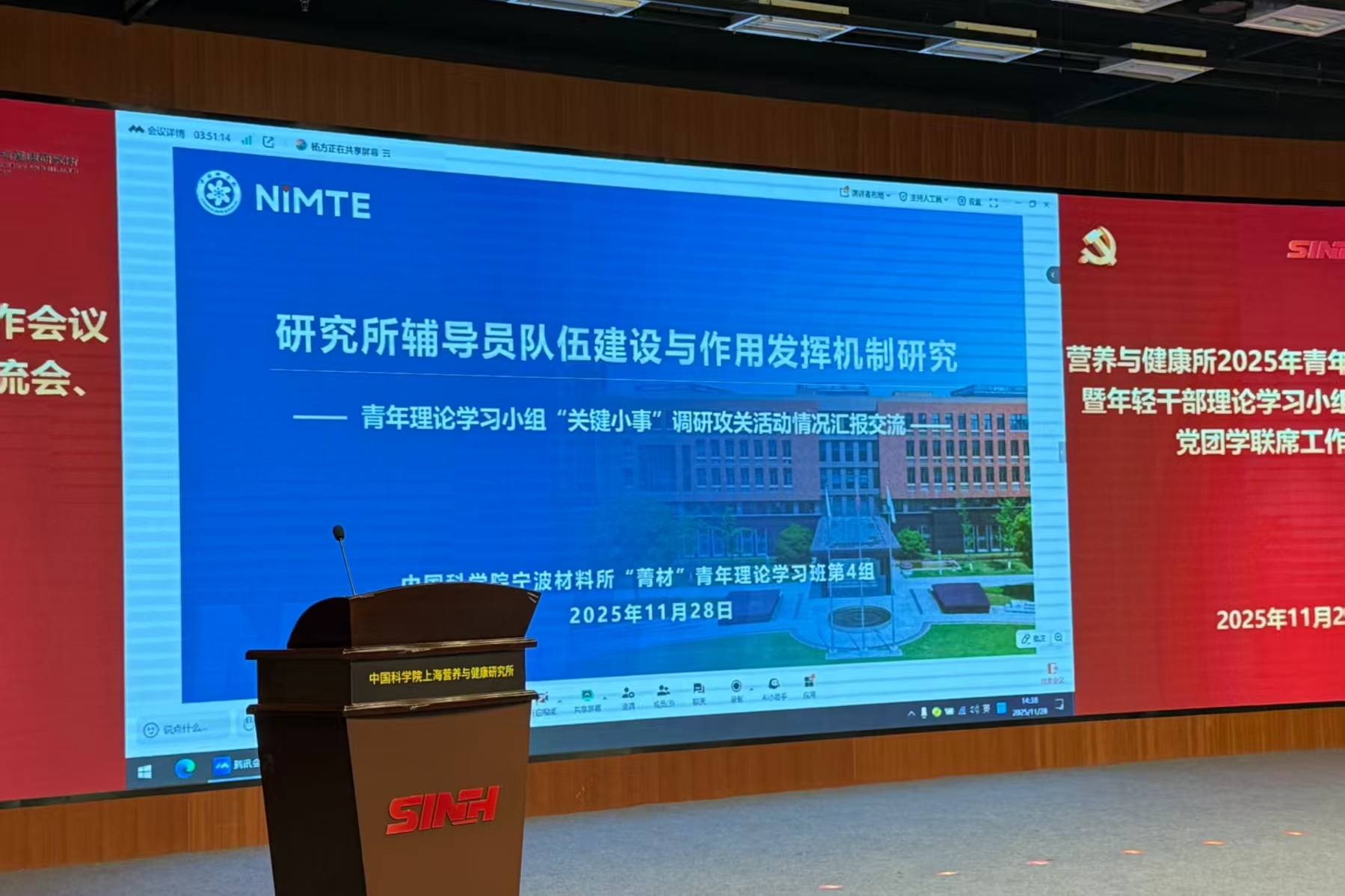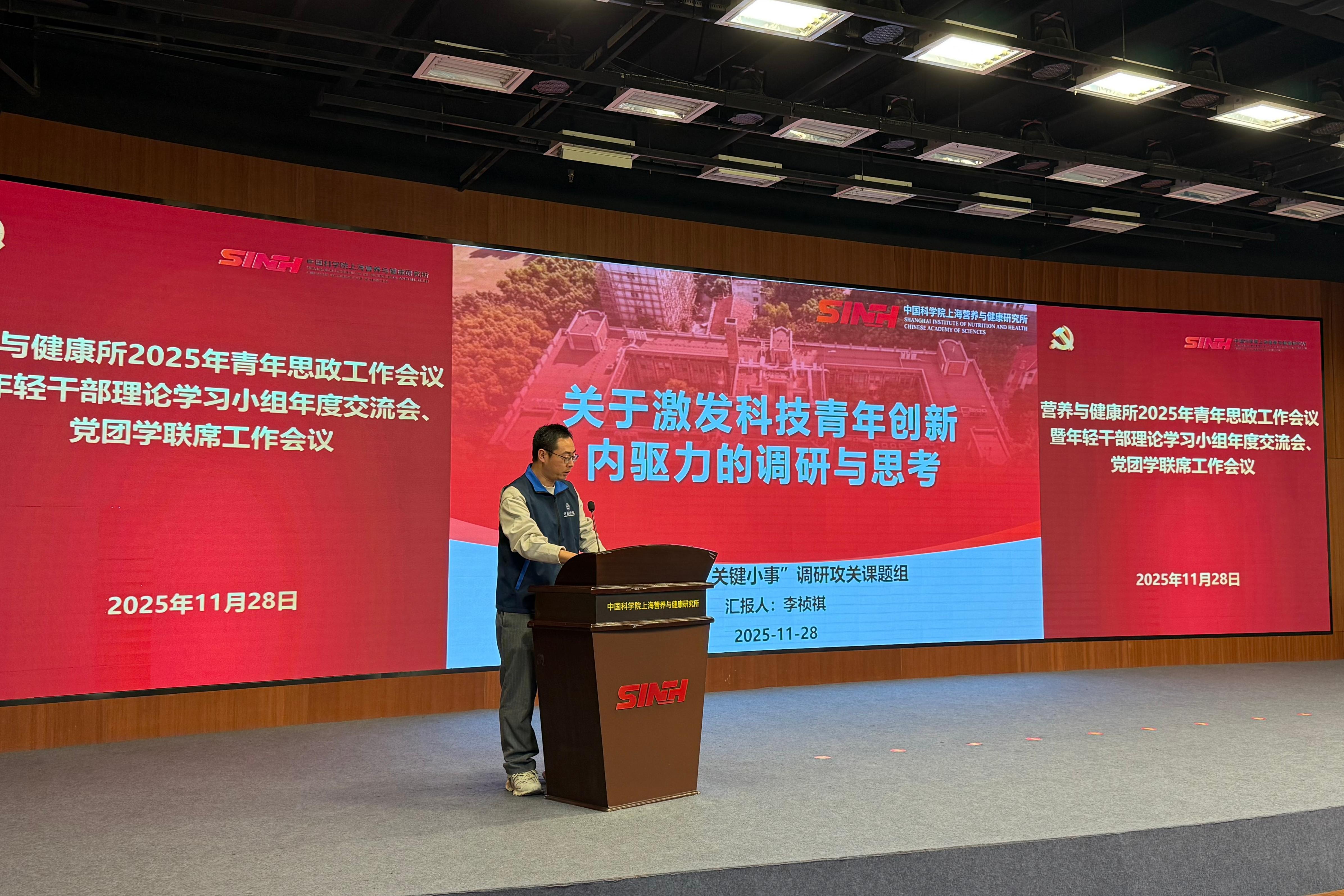 11月28日下午,為進(jìn)一步推動青年干部和科研人員在研究所高質(zhì)量發(fā)展新征程中展現(xiàn)新?lián)?dāng)、實現(xiàn)新作為,中國科學(xué)院上海營養(yǎng)與健康研究所召開2025年青年思政工作會議暨黨團(tuán)學(xué)聯(lián)席工作會議。營養(yǎng)與健康所黨委書記瞿榮輝、紀(jì)委書記曹永、相關(guān)職能部門和黨組織負(fù)責(zé)人、輔導(dǎo)員代表、各支部青年委員、青年理論學(xué)習(xí)小組組長及研究生代表近50人參會。